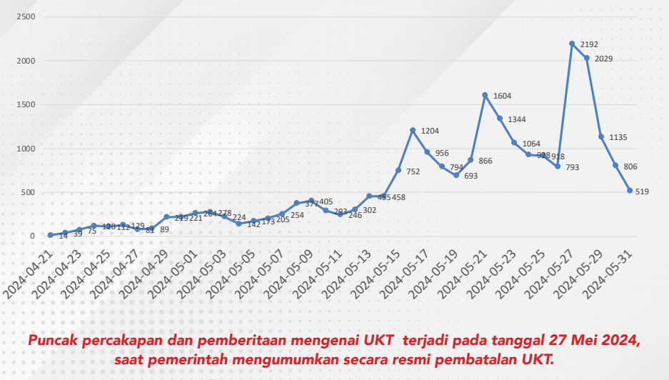 Selama 21 April Hingga 31 Mei 2024, isu UKT (Uang Kuliah Tunggal) diberitakan oleh media online dan posting oleh pengguna